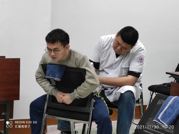 省医院高干病房专家赵子城、省中医医院专家李刚、校医院中医科主任包舰、校医院中医科康复治疗师李双洋、师裴宇新、贾冬雪等专家及医护人员为教工进行中医切脉(号脉)、中医推拿、DMS(深层肌肉放松)、筋膜枪、测血压等项目义诊。校医院党总支书记王滨说:“数学科学学院的教师承担着全校学生的数学基础课,工作量大,讲课任务重,平时没有太多时间去医院就诊,希望此次义诊能为教师们缓解疲劳和病痛,及早发现苗头,及时体检,及早治疗。”并且送出了温馨的礼物和清咽茶饮。学院师生积极参与,义诊现场热闹而有序。在义诊中,有些教师发现了健康隐患,义诊专家给出了进一步检查和治疗的建议。师生纷纷表示,感谢中医专家前来义诊,缓解了疲劳,增长了健康知识,明确了身体不舒适的原因以及调理方案,提升了对健康的重视程度。