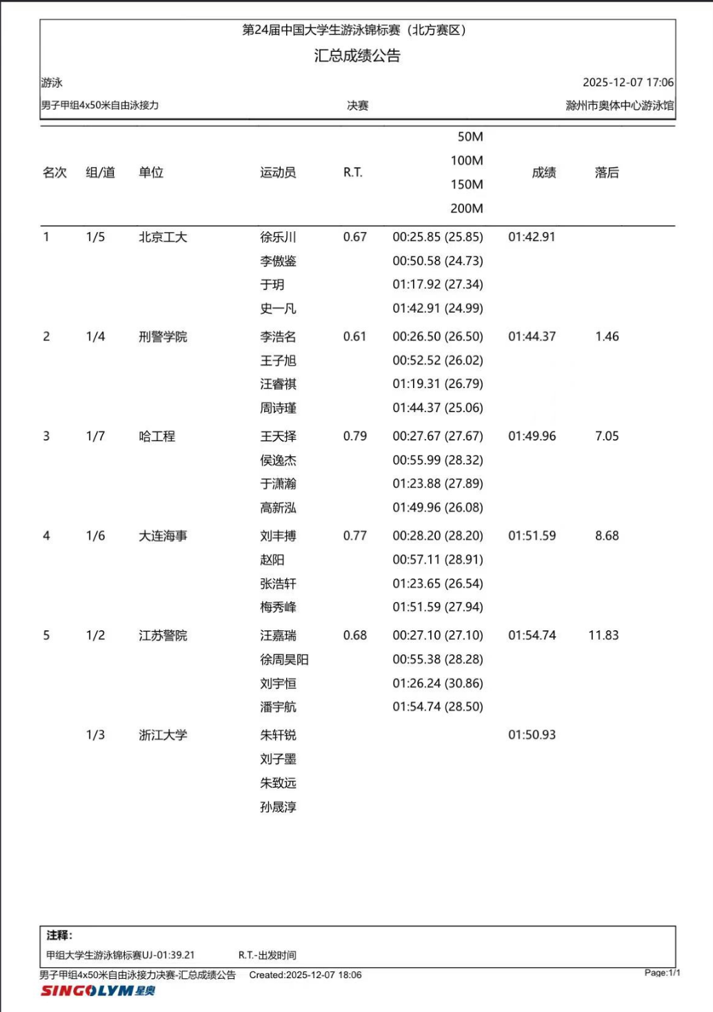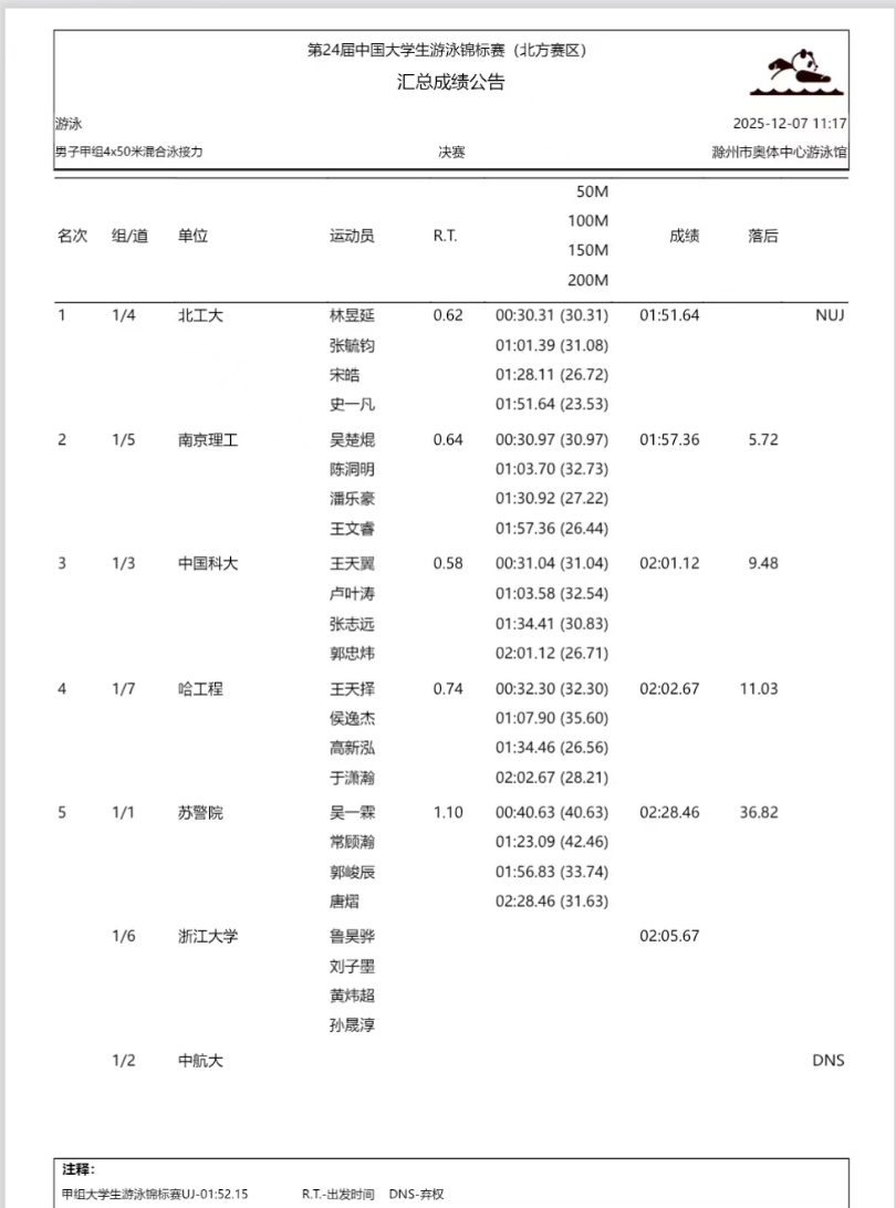 于潇瀚,男,2024级研究生,学号:S324240050。在“男子甲组4*50米自由泳接力”获得第三名,在“男子甲组4*50米混合泳接力”获得第四名。根据荣誉加分规则,给予文体分3.6分。公示期3天,如对学生于潇瀚参加活动情况有异议,请在公示期间向辅导员李晋如反映。